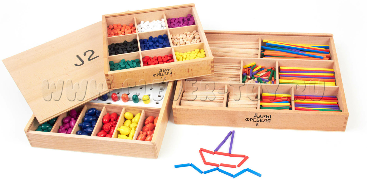 Игровой набор "Дары Фребеля" изготовлен из качественных натуральных материалов (дерева и хлопка). В комплекте 14 модулей и 6 методических пособий соответствующих ФГОС ДО.