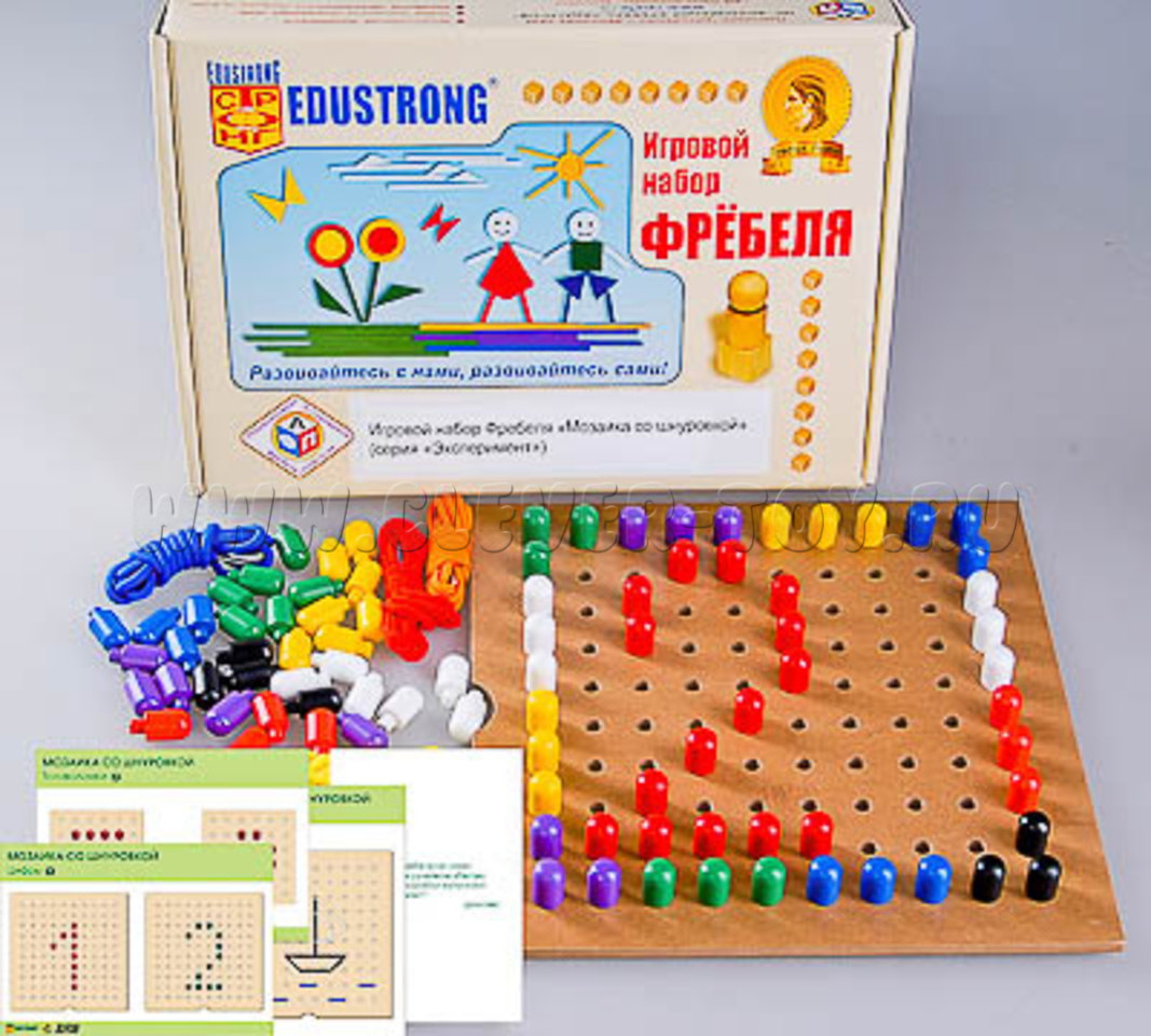 Комплектация: планшет 25*25 см – 1 шт., фишки – 120 шт. (по 15 шт. 8 цветов), шнурки разноцветные – 8 шт., опорные карточки – 20 шт., кубик игральный – 1 шт., руководство по эксплуатации – 1 шт.