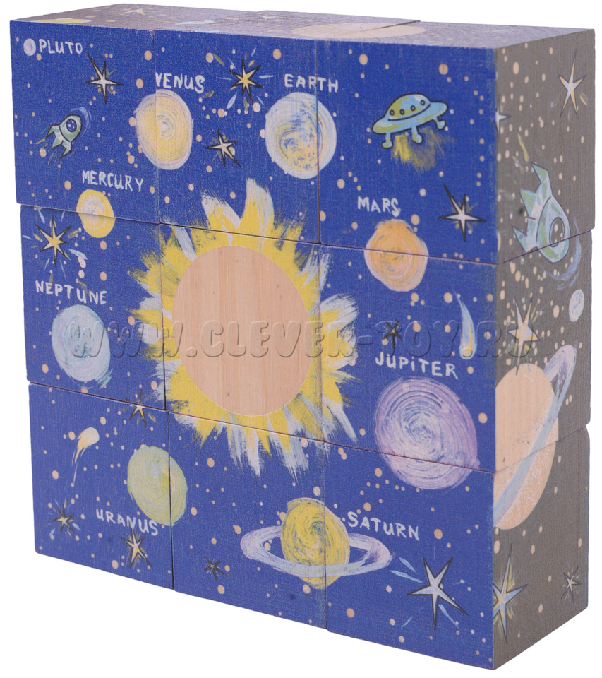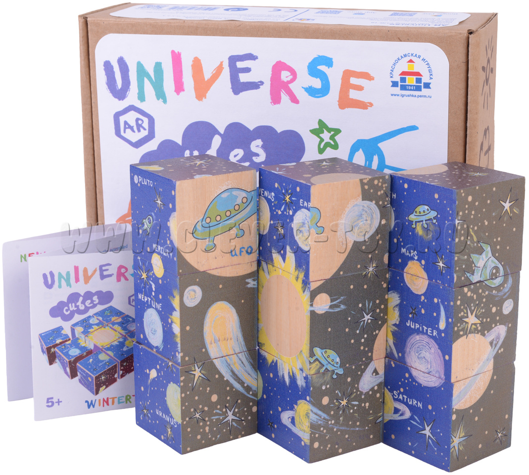 Из кубиков ваш ребёнок может собрать 6 изображений на космическую тему: "Солнечная система", "Луноход", "Спутник", "НЛО", "Восток", "Союз-Аполлон". Мобильное приложение для iOS и Android распознает каждое правильно собранное изображение, и перед глазами ребёнка чудесным образом появляется анимированная 3D модель Солнечной системы. Каждый элемент этого интерактивного представления активен: нажав на любую планету, ракету, спутник, родители и дети узнают интересные факты о жизни планет и устройстве космических кораблей.