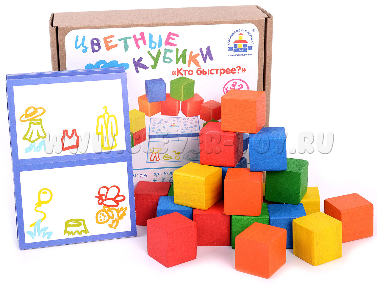 Правила. Игроки расставляют кубики по соответствующим цветам элементов на карточке с заданием. Кто первым это сделает - забирает картинку. Победителем окажется обладатель наибольшего количества карточек.
