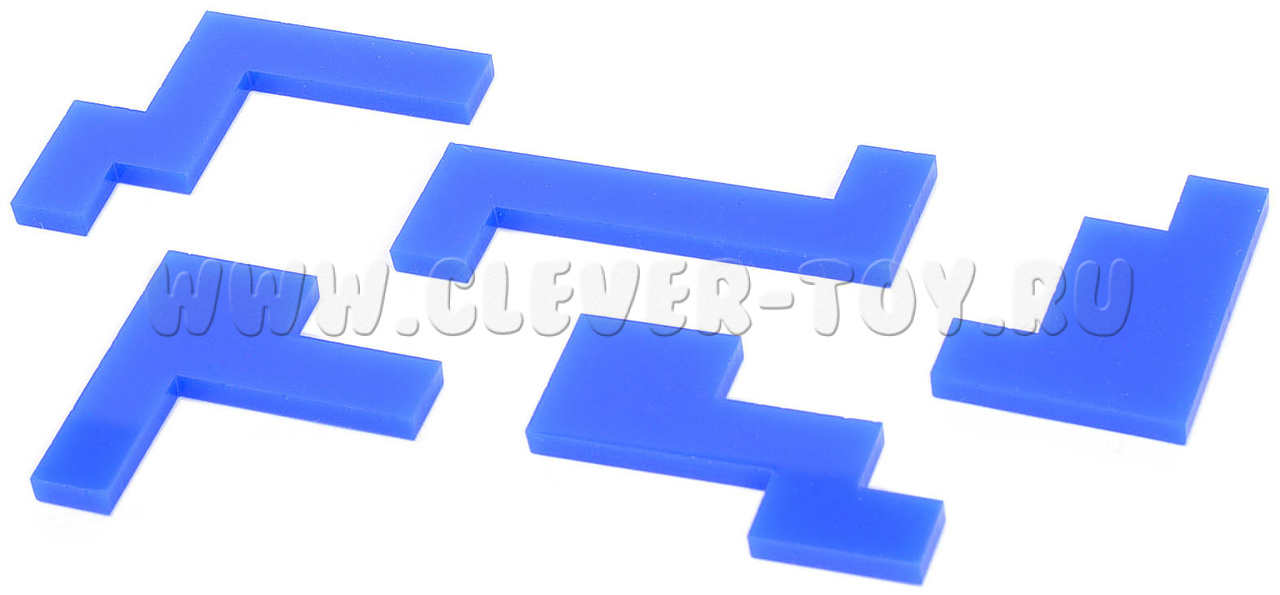 Нужно разместить все элементы в коробочке. Как обычно в таких задачах, элементы можно как угодно поворачивать и переворачивать, но нельзя накладывать друг на друга. При этом общая площадь всех элементов составляет около 80% площади квадратной ниши, так что свободного места для размещения всех пяти элементов достаточно. Однако, задача не так проста. Известно единственное решение этой головоломки.