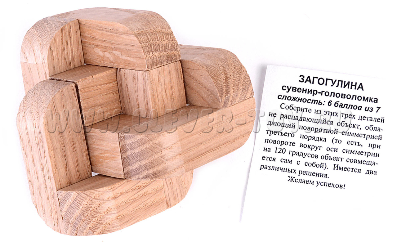 Соберите из 3 деталей не распадающийся объект, обладающий поворотной симметрией третьего порядка (то есть, при повороте вокруг оси симметрии на 120 градусов объект совмещается сам с собой).