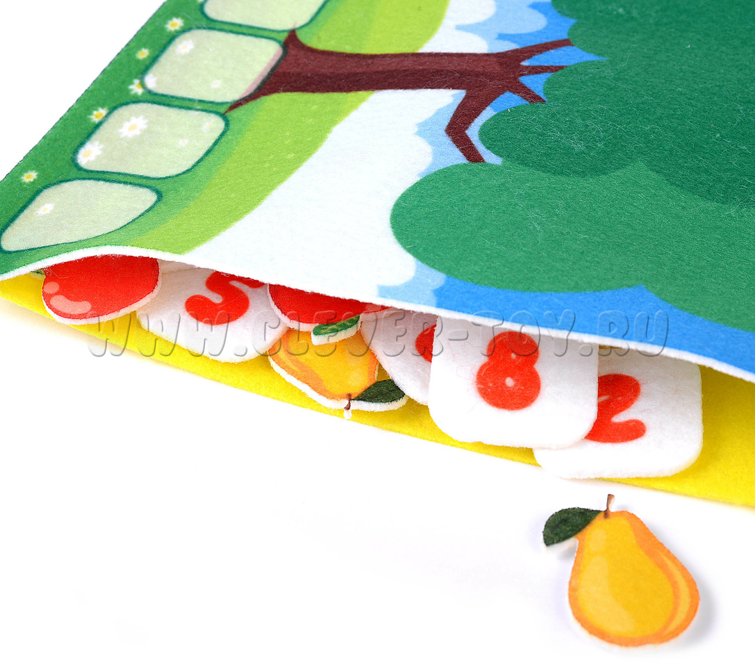Все игровые элементы пособия выполнены из современного материала – фетра. Он обладает рядом удивительных свойств: мягкий, яркий (окрашен безопасными красками), прочный и долговечный. Детали аккуратно вырезаны на специальном станке, легко крепятся на игровое поле с помощью липучек.