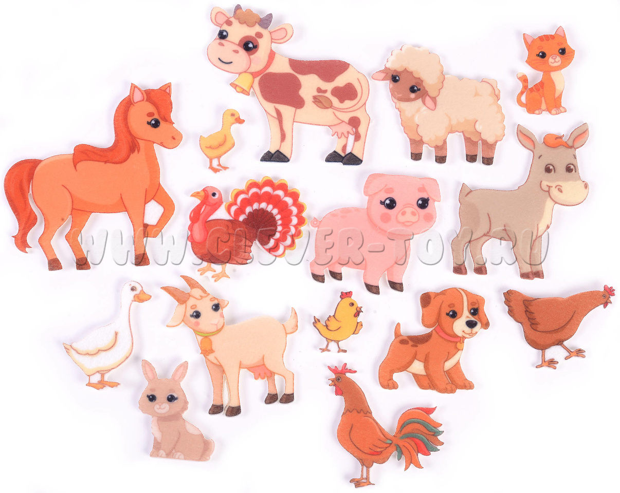 - 16 фигурок животных из фетра - коровы, куры, лошади, гуси, овцы, свиньи, коты, собаки, птички, мышки (мамы, папы и детёныши),