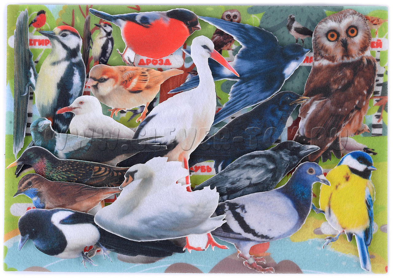 - Набор из 16 фигурок птиц на липучках (снегирь, дятел, дрозд, сова, ворона, воробей, ласточка, соловей, синица, сорока, скворец, голубь, чайка, аист, лебедь, грач)