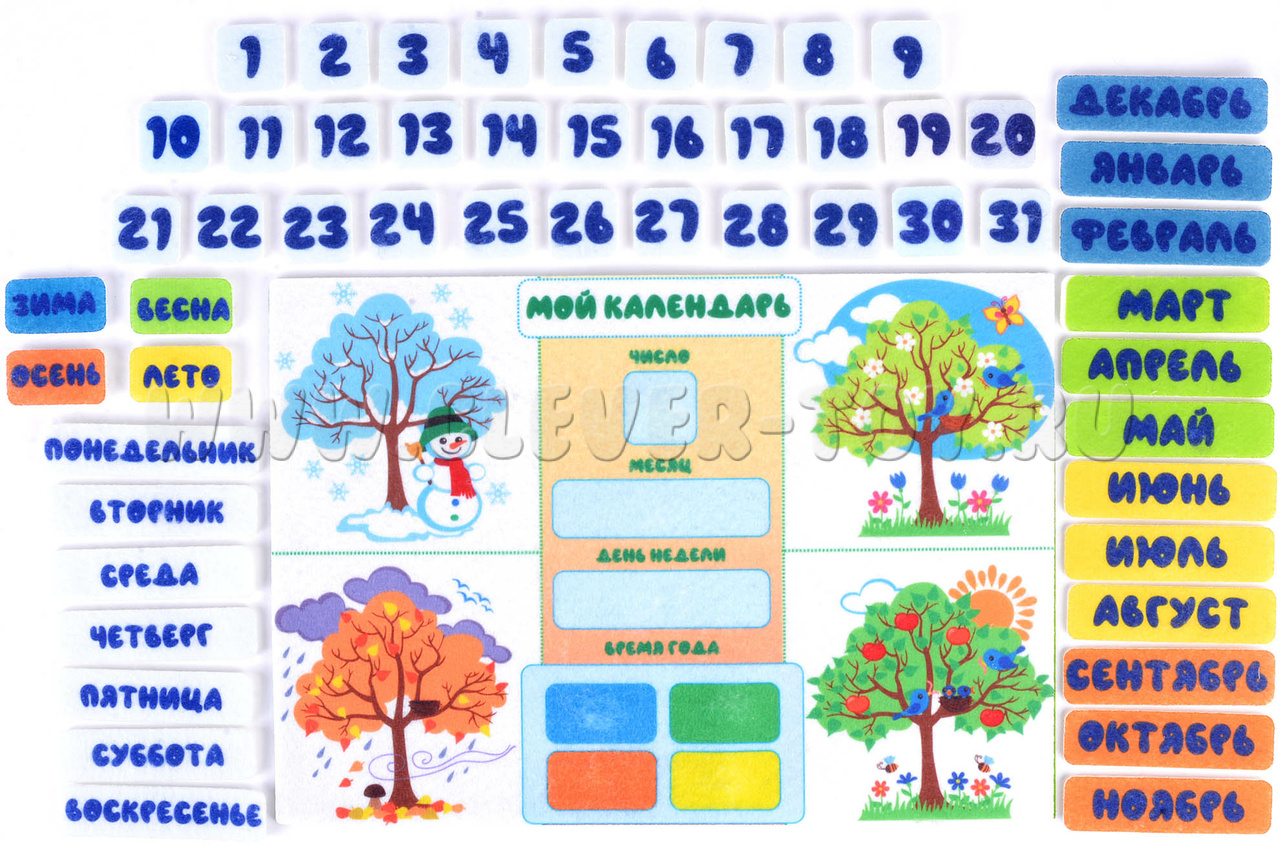 - игровые элементы: числа от 1 до 31, элементы с названиями дней недели, месяцев, времён года и т.д.