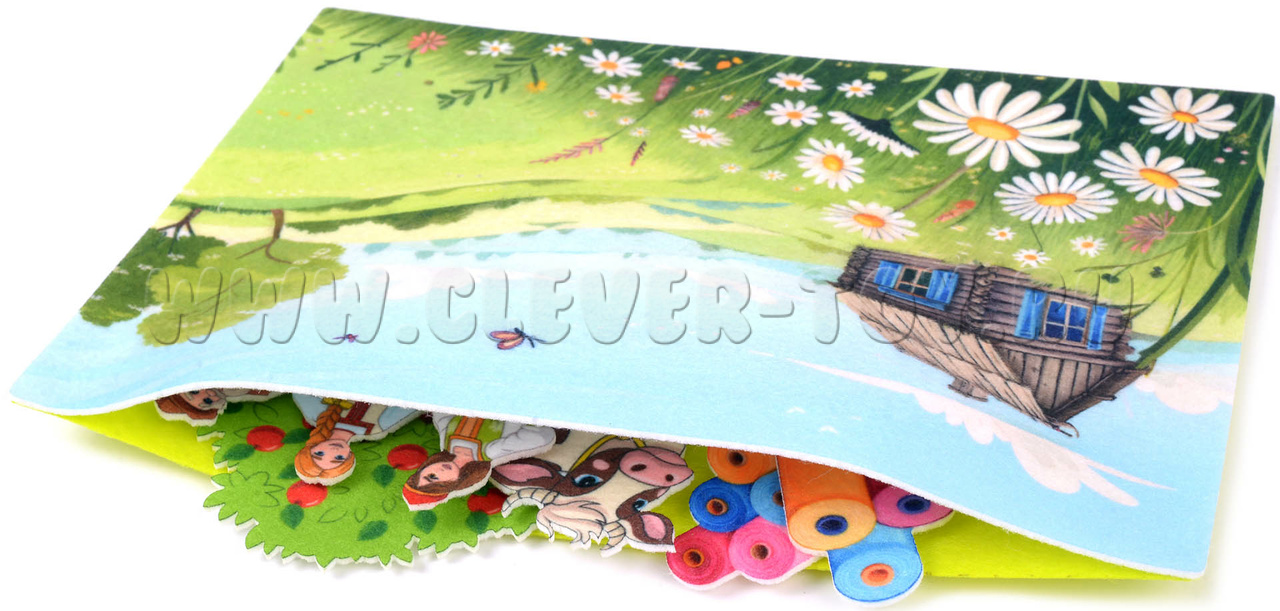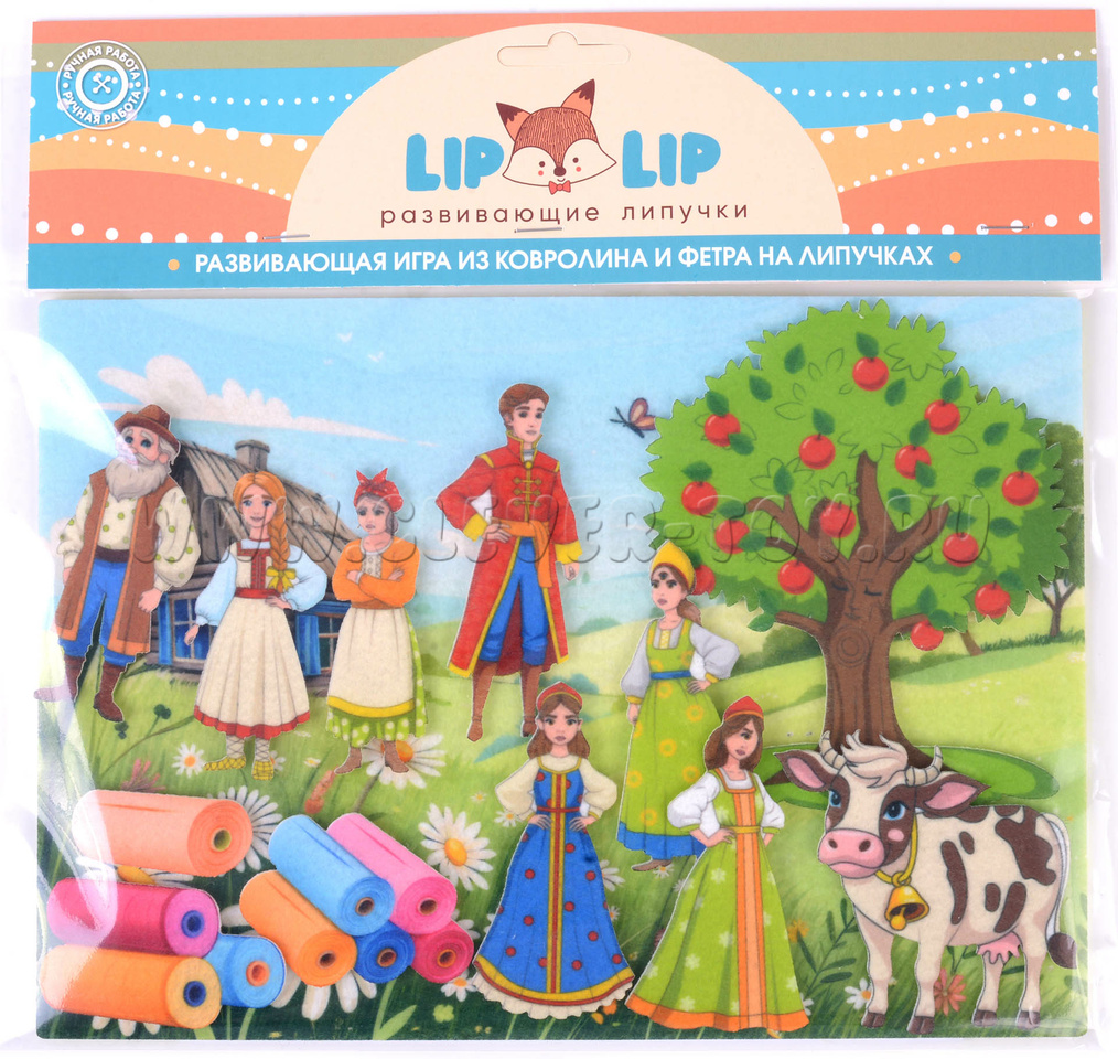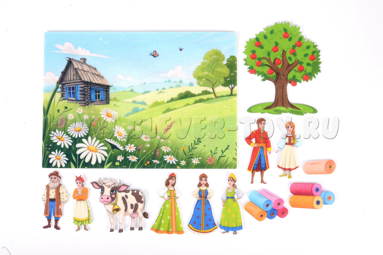 • Фигурки на липучках: Хаврошечка, три сестры, мачеха, волшебная коровка, барский сын, яблоня.