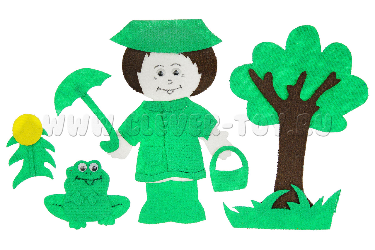 - одежда, аксессуары и атрибуты весны (зелёный): шапка, пальто, сапоги, корзинка, зонт, дерево, трава, лягушонок, цветок;