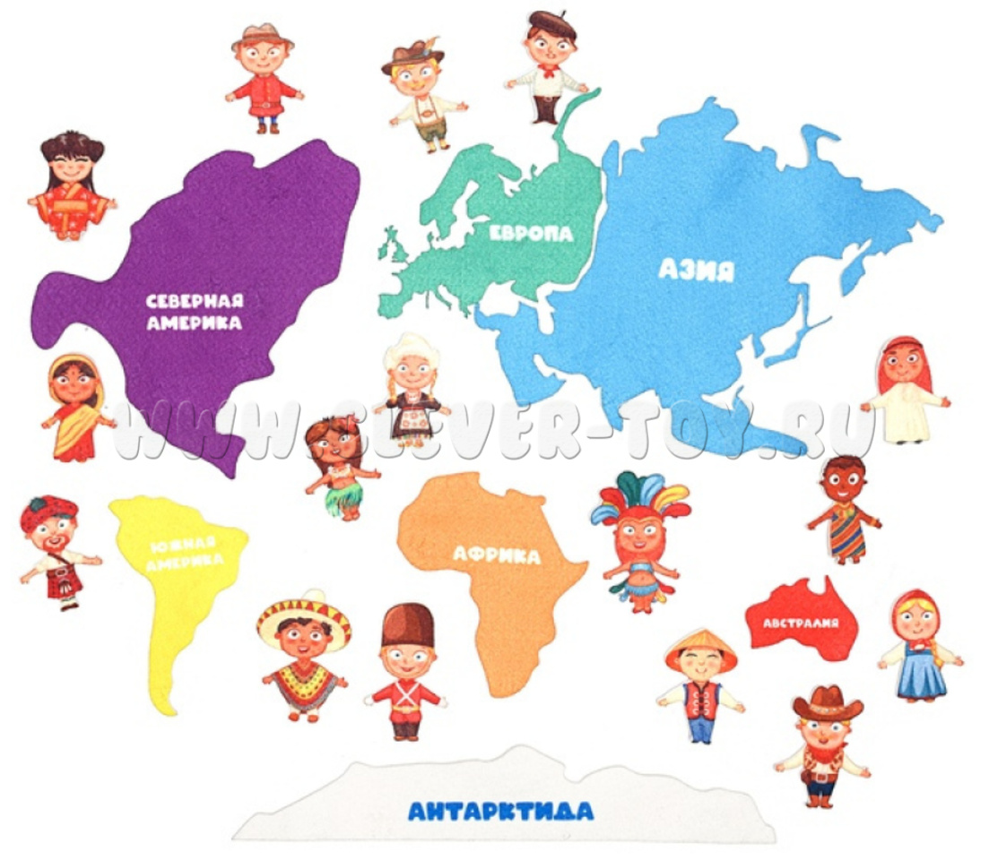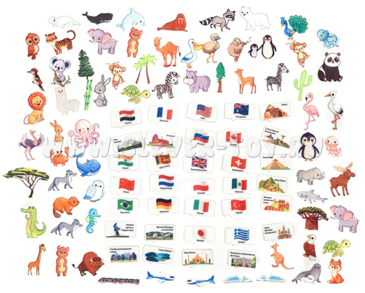 1. Знакомство с понятиями карта мира: расскажите ребёнку про материки и океаны, покажите, где мы живём. Познакомьте с понятием «страна». Предложите малышу разместить съёмные элементы на игровом поле, поясняя их особенности и местоположение, или предложите ребёнку самостоятельно расположить объекты, задавая наводящие вопросы.