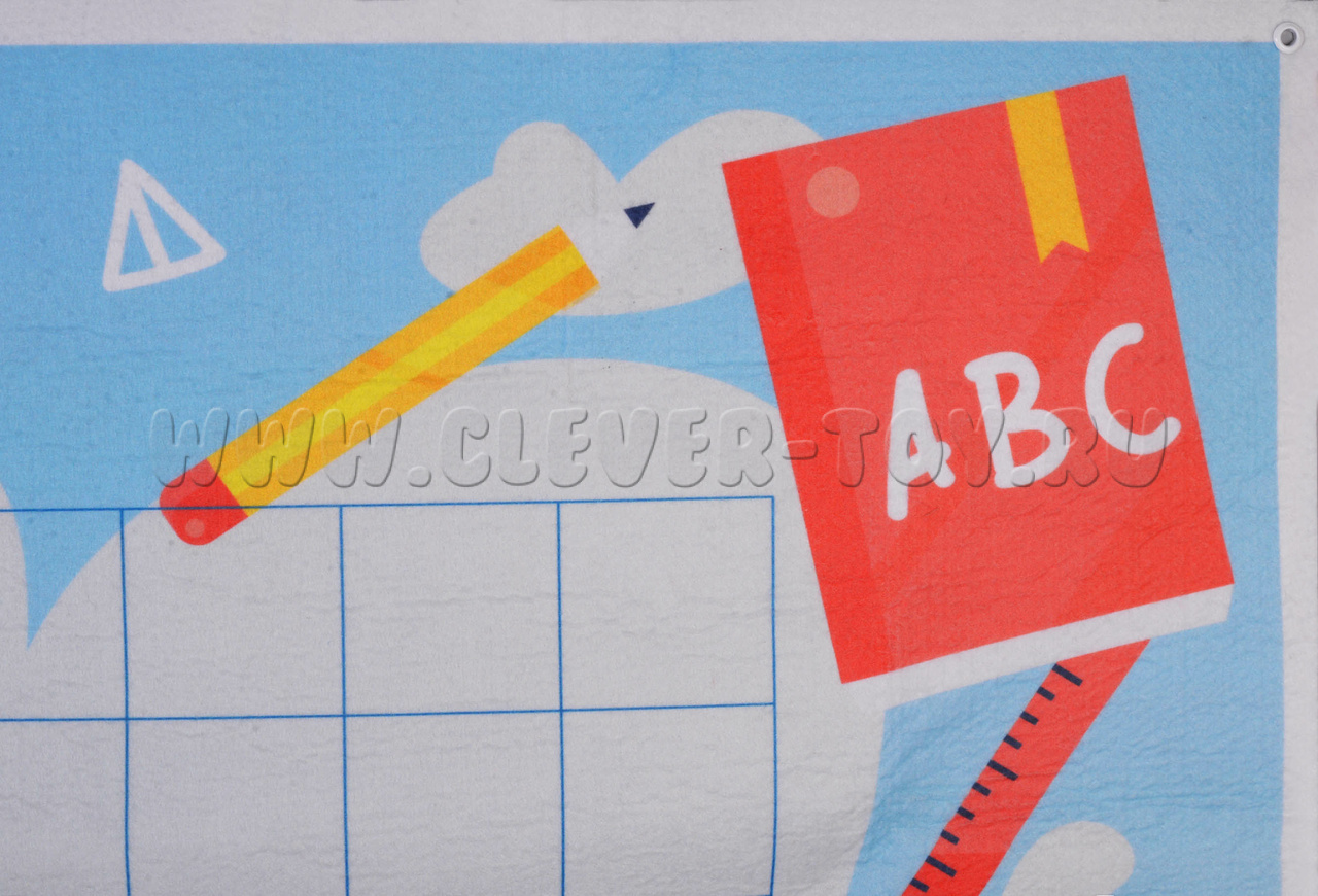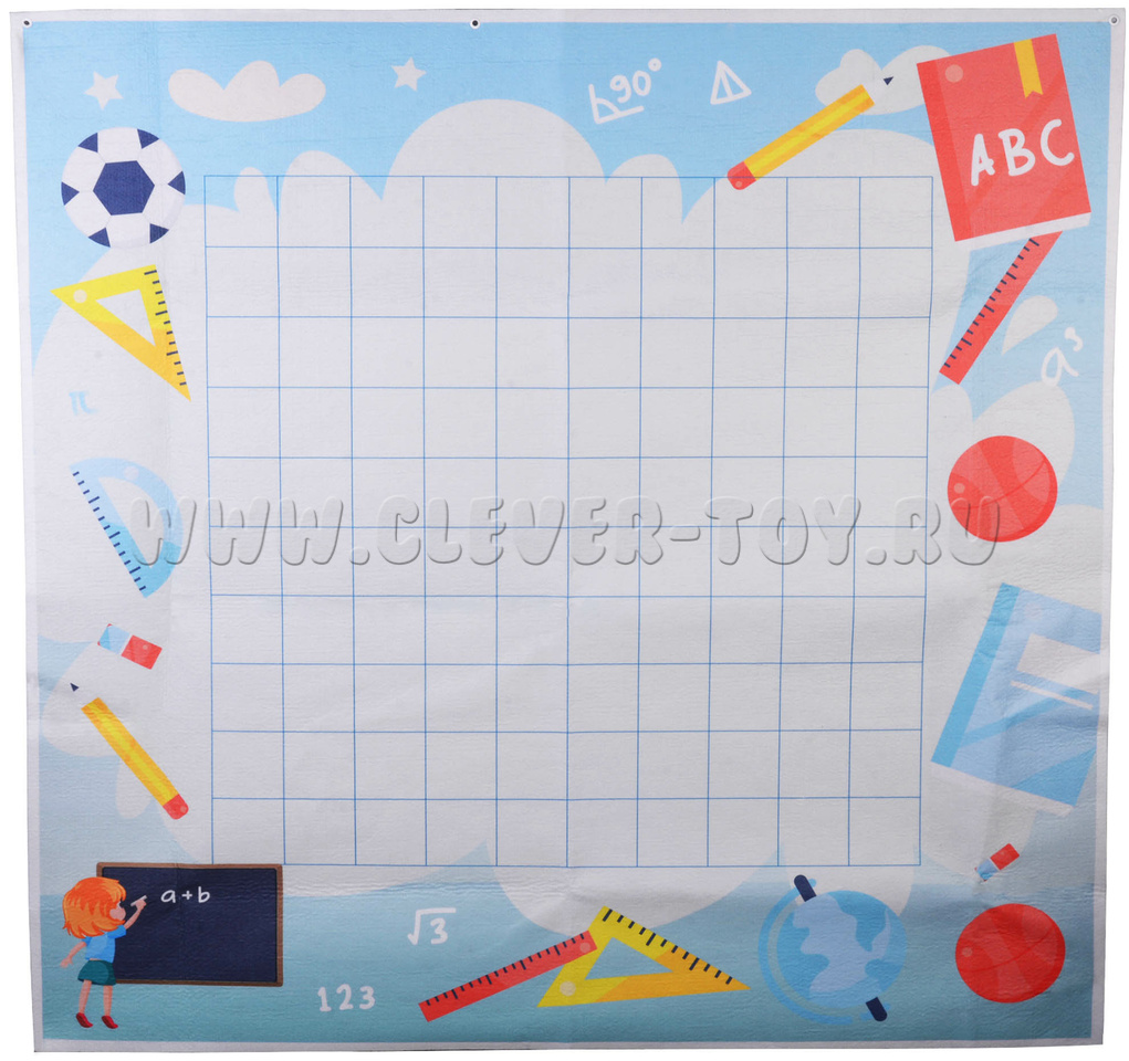 В упаковке находится большое игровое панно с нанесёнными на него клетками, что поможет детям в игровой форме познакомиться с понятиями «Цифра», «Число», «Сложение», «Вычитание», «Равенство» и т.д. В дальнейшем – в начальной школе – ребёнок будет психологически готов к урокам по математике. Вокруг клеток также есть изображения различных школьных атрибутов, маленькая школьная доска.