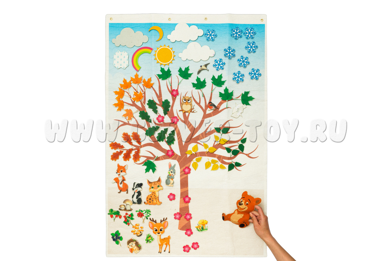 Игра-конструктор «Путешествие по временам года» - незаменимое игровое пособие из современного материала – фетра. На большом панно с изображением дерева могут разместиться забавные животные, лесные жители, ягоды, листики, грибы, снежинки, - количество игр ограничено только вашей фантазией!