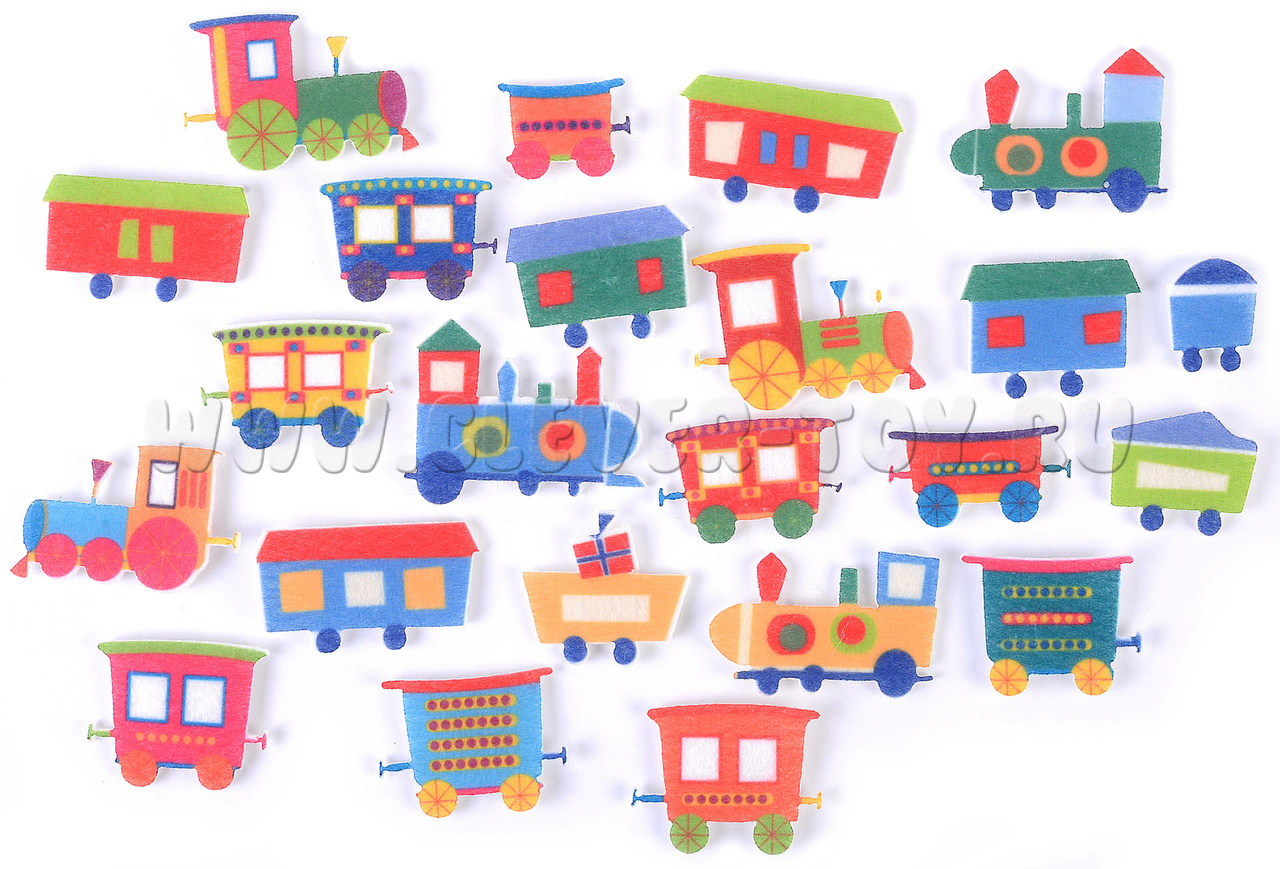 • 23 разноцветных вагончика и локомотивов из фетра;