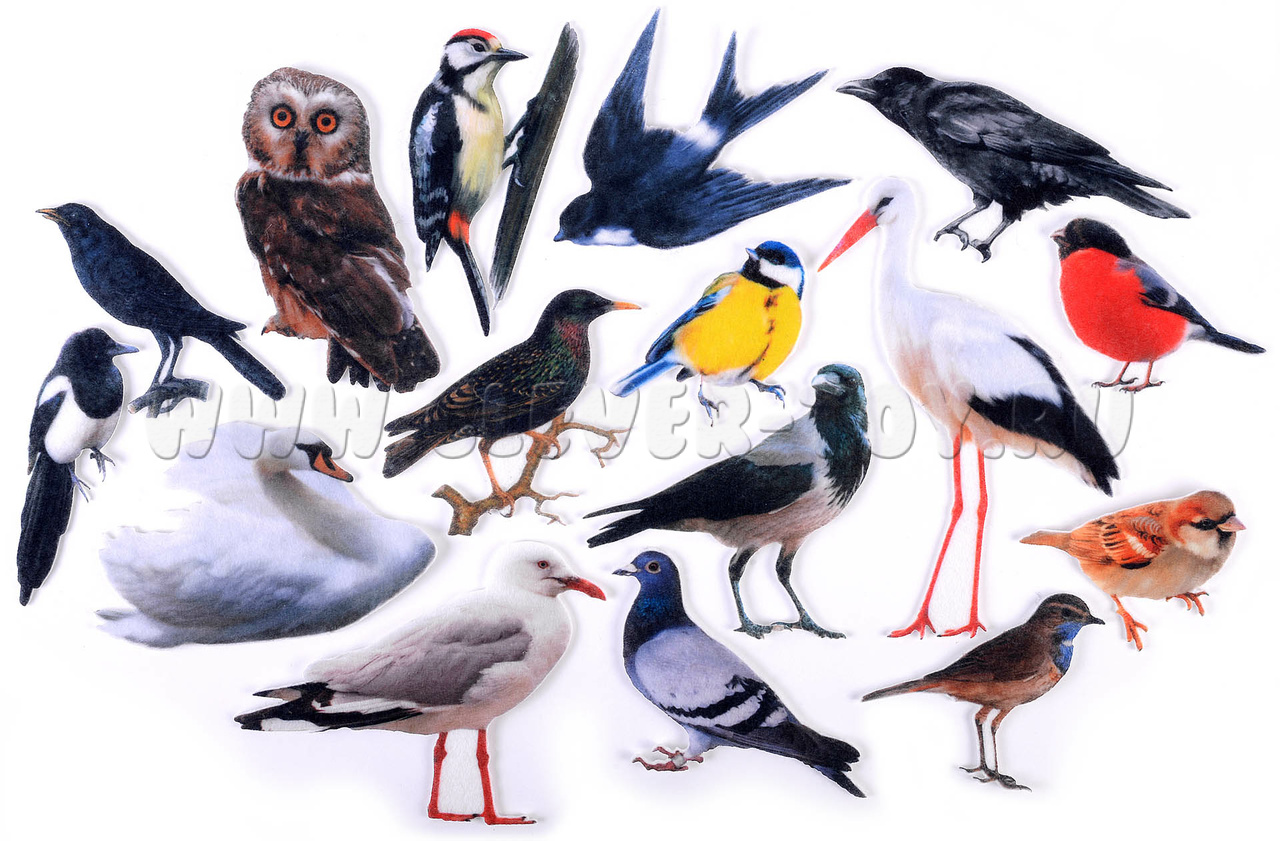 • Фигурки с изображением птиц: 16 шт. (снегирь, дятел, дрозд, сова, ворона, воробей, ласточка, соловей, синица, сорока, скворец, голубь, чайка, аист, лебедь, грач) Размером от 9 до 19 см.