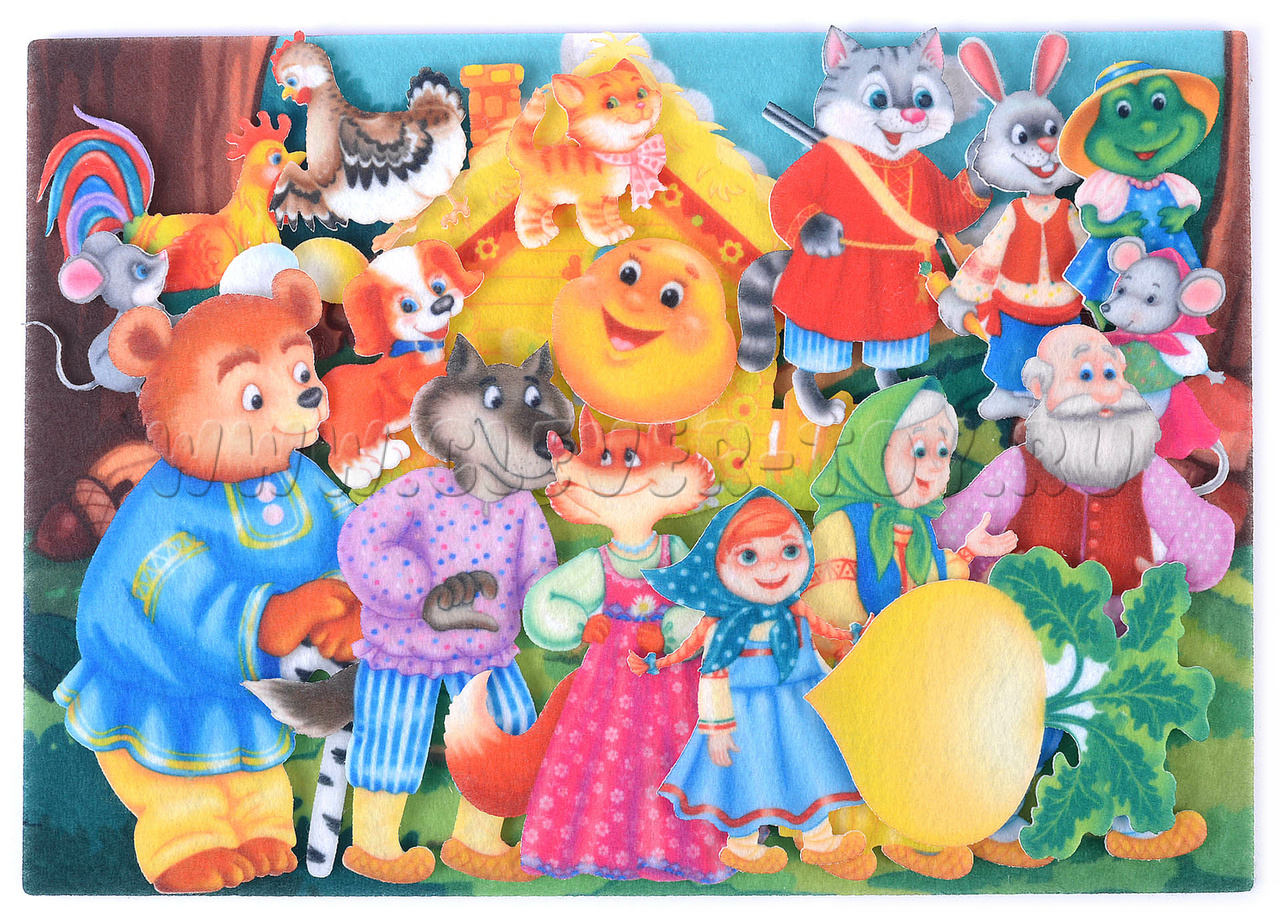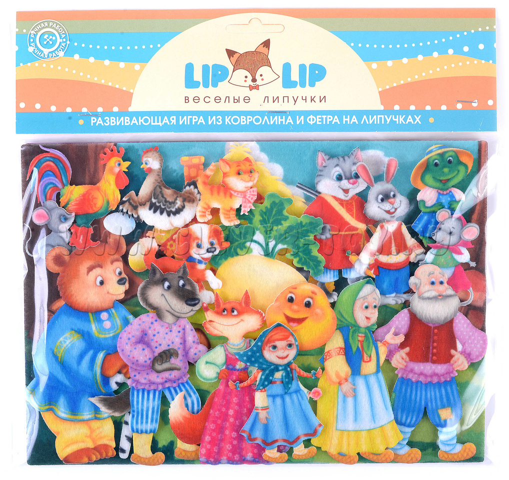В комплект входят игровые элементы для пяти известных сказок: «Колобок», «Теремок», «Курочка Ряба», «Репка» и «Маша и медведь». Фигурки можно передвигать по полю или прикреплять с помощью липучек.