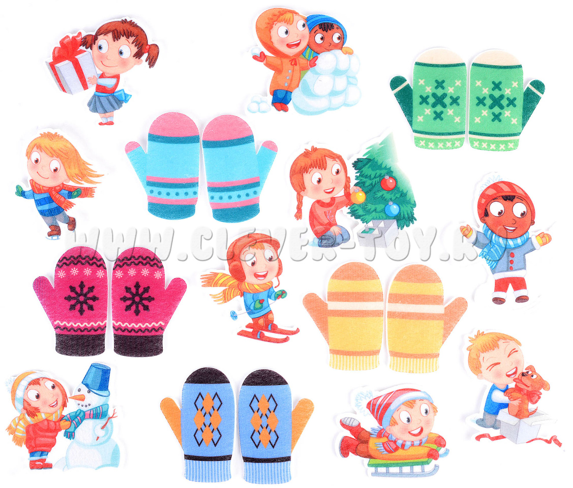 • Фигурки детей, иллюстрирующих зимние занятия: девочка со снеговиком, мальчишки, играющие в снежки, паренек, валяющийся в снегу, мальчишка, мчащийся на санках, паренек на лыжах, мальчик, радующийся подаренному щенку, девчонка с подарком, девчушка, катающаяся на коньках, и девочка, наряжающая елку (9 шт.);