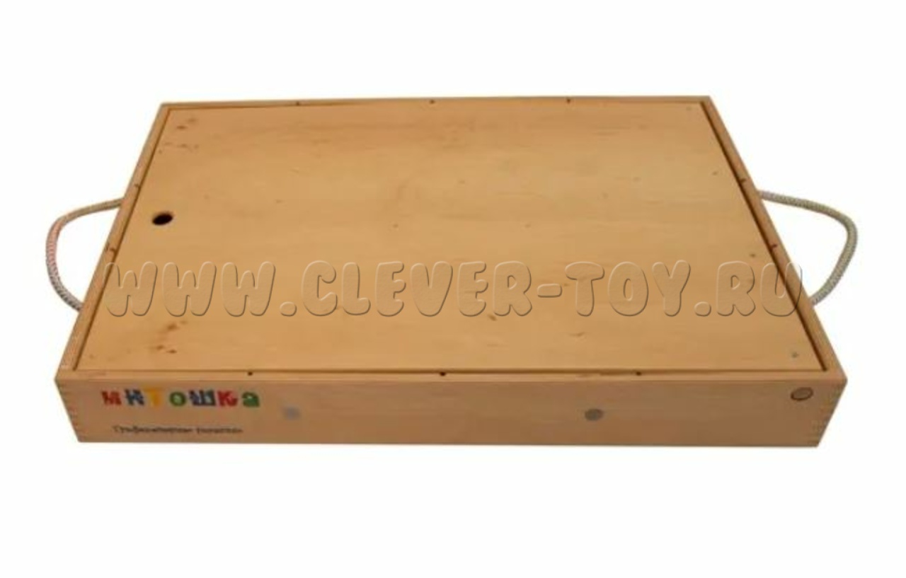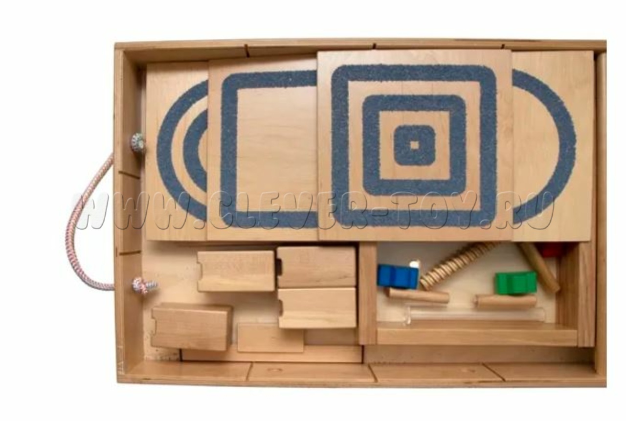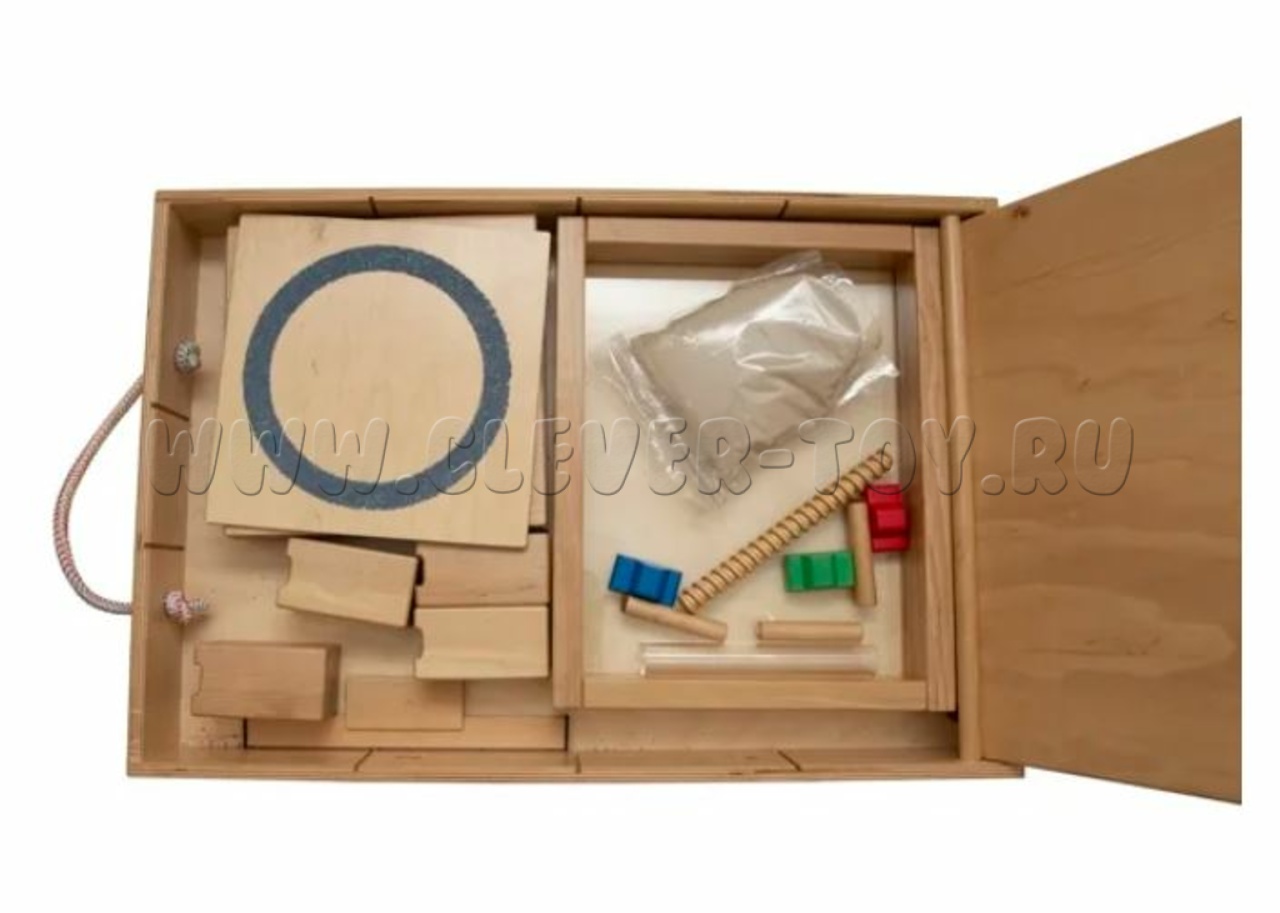 Включает в себя поддон для песка с прозрачным дном, четыре деревянные подставки под него, скребок для выравнивания поверхности песка, песочный карандаш - трубку для рисования, три магнитные машинки и 10 тактильных досок с различными рельефными рисунками.
