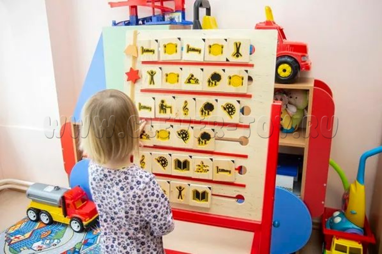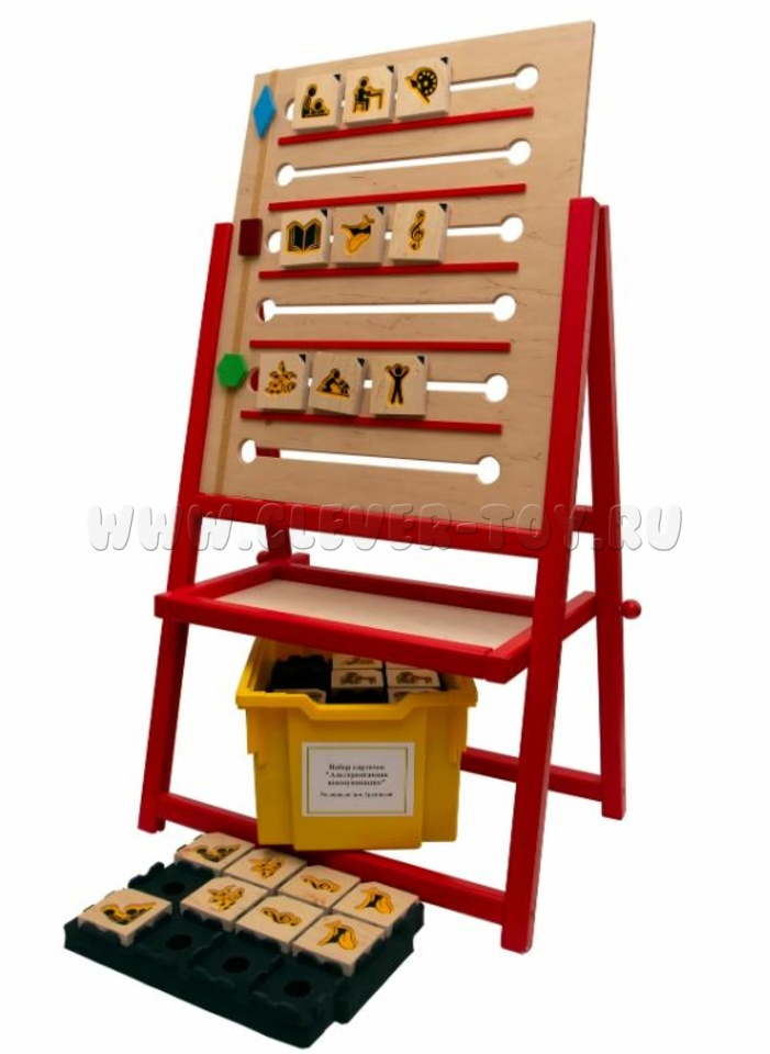 Набор включает в себя панель, мобильное основание для панели и 48 карточек для альтернативной коммуникации, расположенных в ложементах в пластиковом контейнере (массаж, занятия монтессори, рисование, музыка, логопедические занятия, книга, учится, играть, есть, спать, прогулка, зарядка).