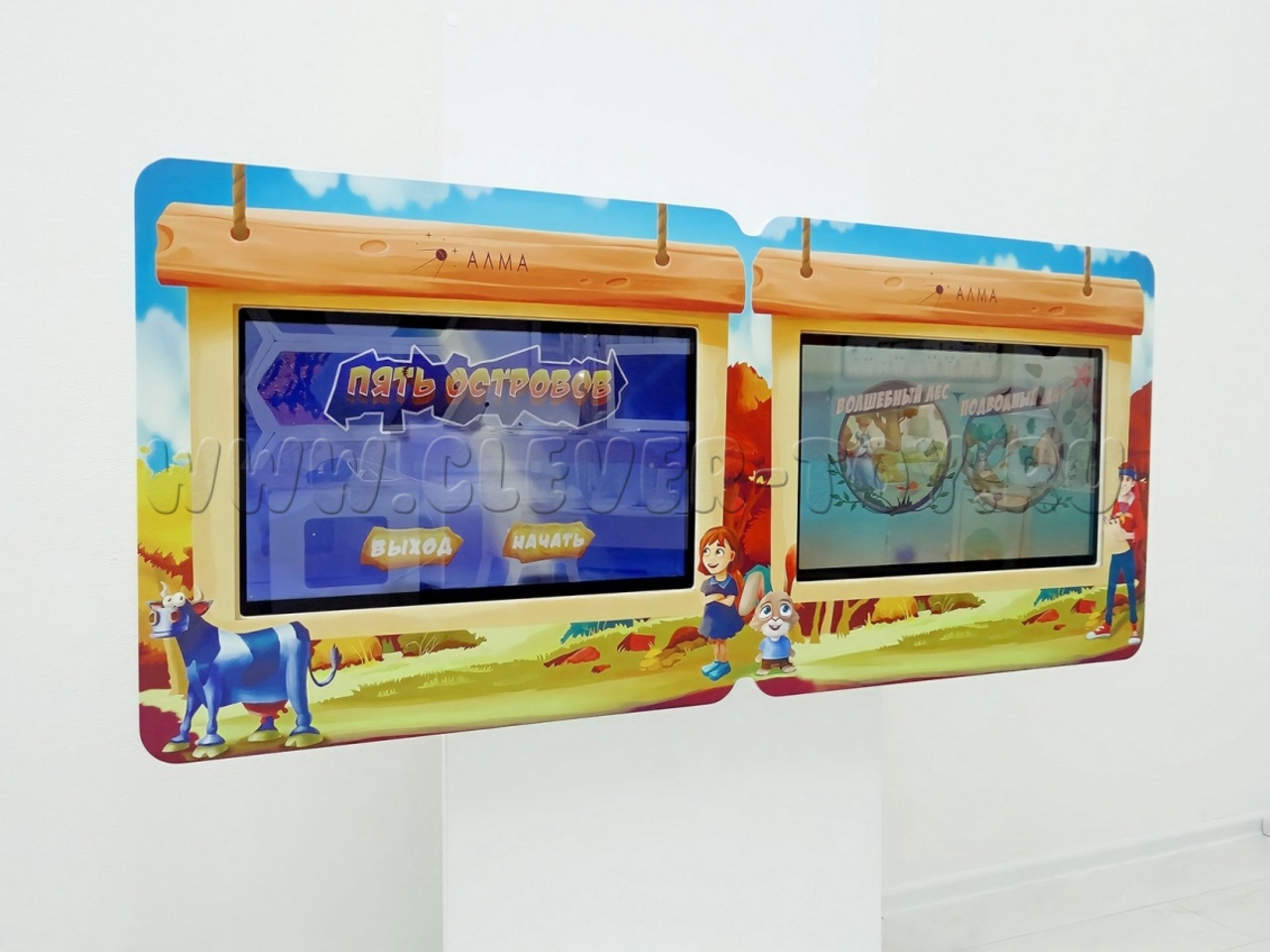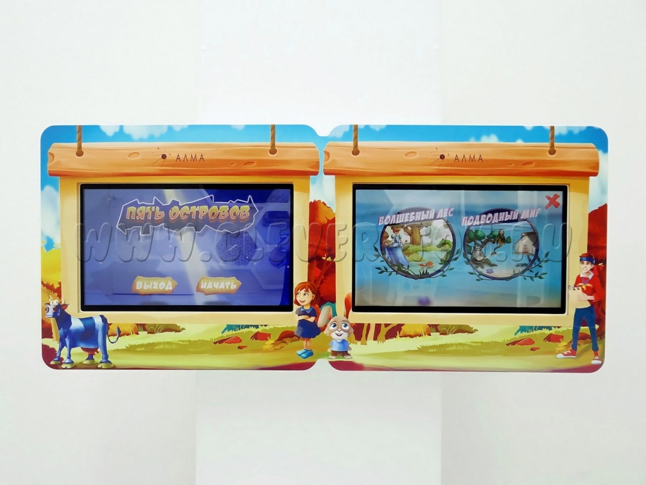 1. ДВЕ интерактивных настенных панели по 25 дюймов в одном корпусе, украшенным детскими картинками и персонажами из программного обеспечения (Full HD, мультитач 10 касаний, intel, 4 гб RAM, SSD 120 гб, win 10);