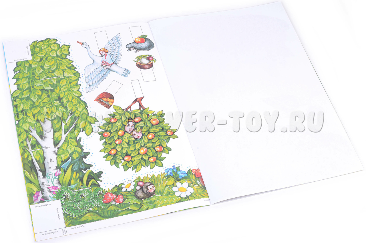 - Действующих персонажей выполненных из плотного картона, созданных для показа настольного театра. Средний размер персонажей, составляет 12 см. (Задача ребенка состоит в том, что нужно вырезать по пунктирным линиям 7 персонажей печку, яблоню, лес, избушку и склеить их);