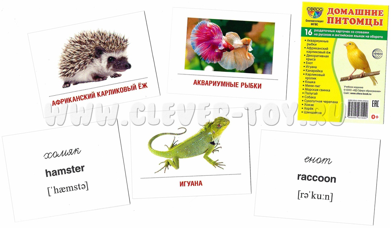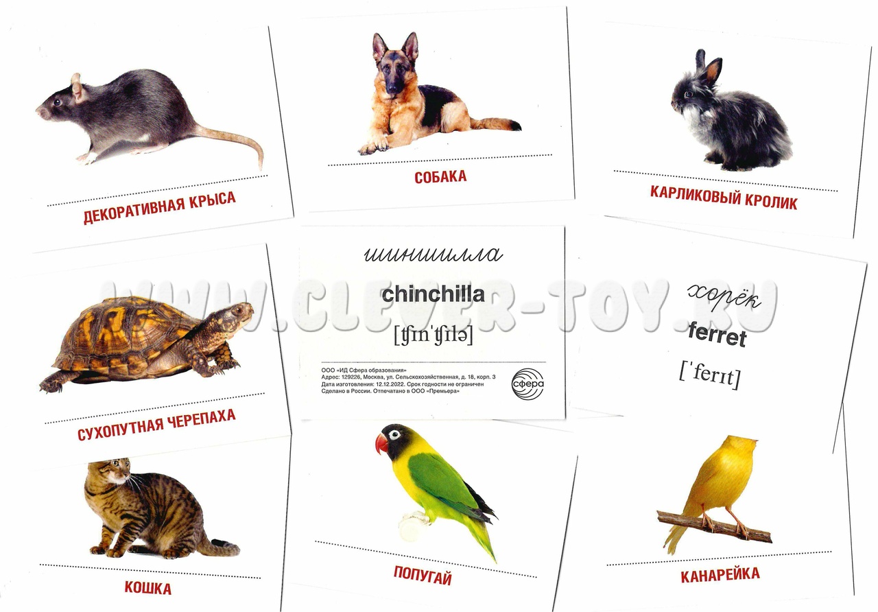 На каждой карточке на лицевой стороне размещено цветное изображение домашнего любимца, а на обратной – название на русском и английском языке с транскрипцией.