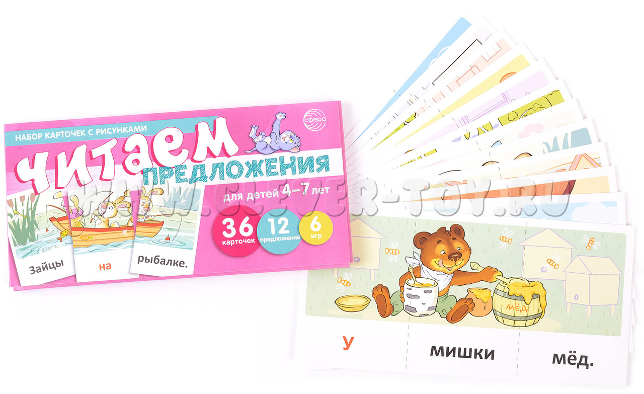 В комплект входят 12 обучающих картинок, которые состоят из 36 карточек и 12 предложений. Этот материал является продолжением тематического комплекта "Читаем по слогам. Трехсложные слова", выпущенного издательством "ТЦ Сфера".