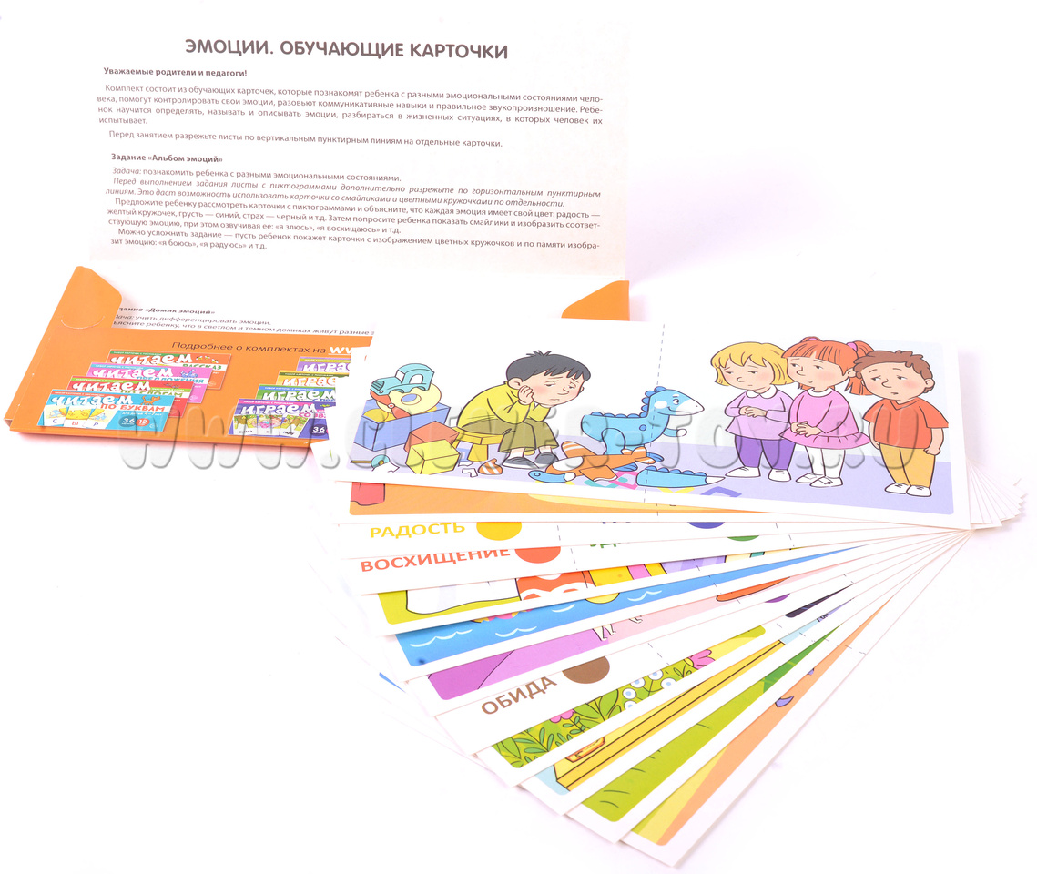 Обучающий комплект "Эмоции" - это 12 листов, которые включают 36 карточек и 4 задания. Он является логическим продолжением диагностического комплекта "Эмоции", выпущенного издательством "ТЦ Сфера".