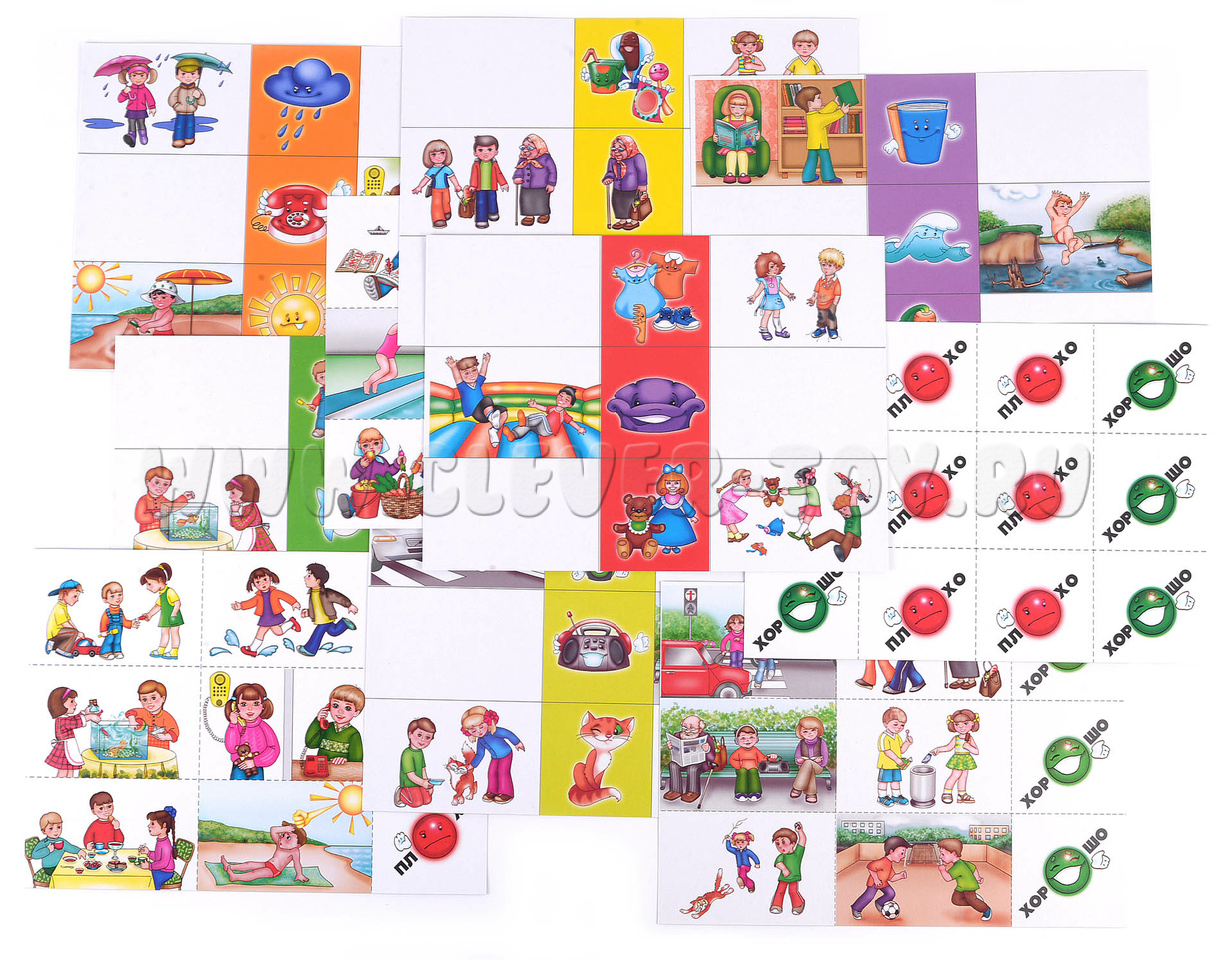 В комплект игры входят: 6 больших карт; 4 разрезные карты, состоящие из 18 карточек-картинок и 21 фишка «Хорошо» и «Плохо».