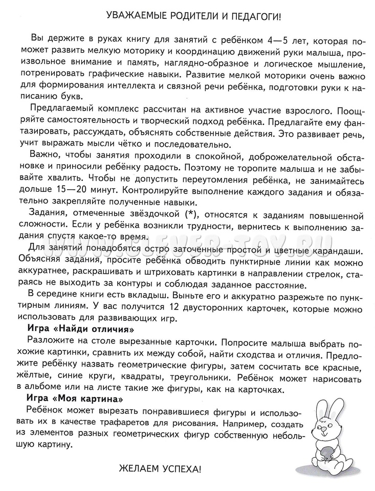 Издание для занятий с детьми 4-5 лет поможет развить мелкую моторику и координацию движений руки ребёнка, его зрительное внимание, мышление и память, потренировать графические навыки. Развитие мелкой моторики очень важно для формирования интеллекта и связной речи ребёнка, подготовки руки к написанию букв. В середине книги есть картонный вкладыш. Это 12 двусторонних карточек для развивающих игр. Предназначено родителям и педагогами для занятий с детьми 4-5 лет.