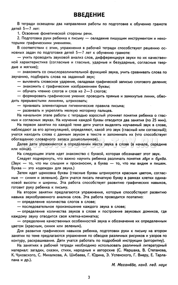 Рабочая тетрадь может быть использована как на занятиях по обучению грамоте, так и для индивидуальной работы с ребенком в нерегламентированное время дома и дополняется методическим пособием Подготовка к обучению грамоте детей 5-7 лет. Рабочая тетрадь и методическое пособие адресованы воспитателям ДОО, родителям, гувернерам - всем, кто готовит детей к школе.