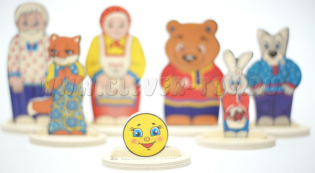 - 7 деревянных фигурок на подставках (Колобок, Дед, Бабка, заяц, медведь, волк, лиса) размером от 4 до 12 см.