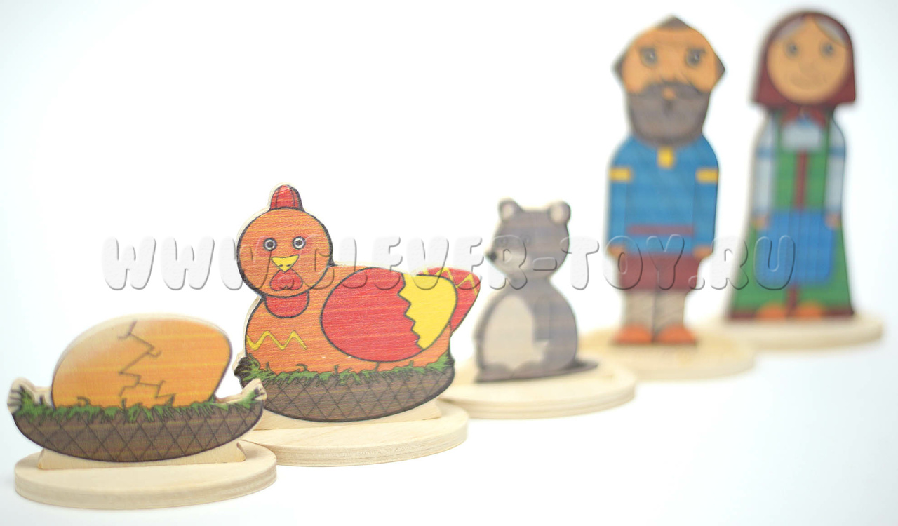 • 5 сказочных персонажей на подставках(Дед, Бабка, Курочка, Мышка, Яйцо) от 5 до11,5 см.;