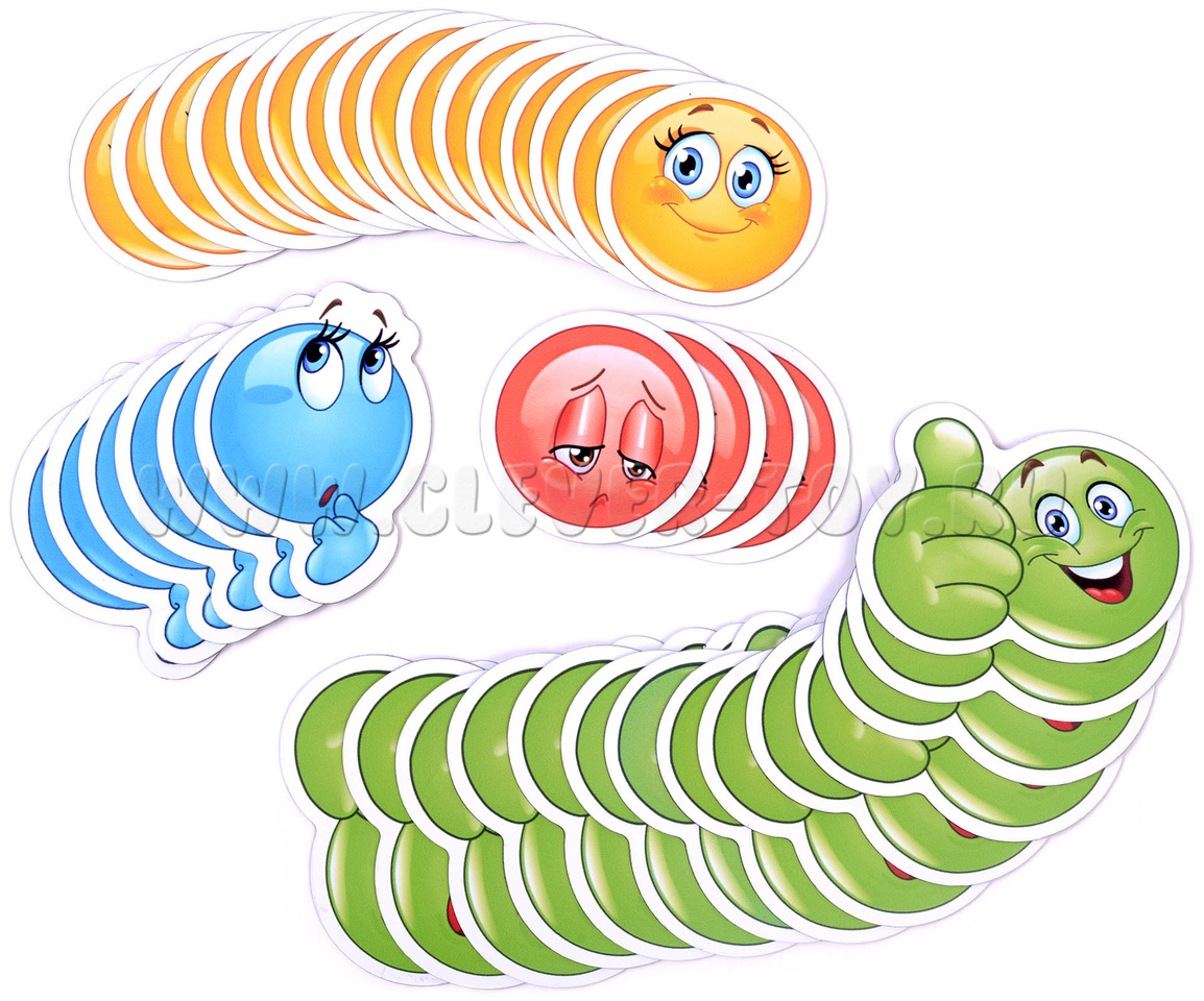 Эти смайлики-оценки отлично подойдут для школьной доски. Например, если ребёнок решает математическую задачу в четыре действия, и первые два выполнены идеально, можно поставить зелёный смайлик. Если в третьем действии допущена ошибка, то это будет синий смайлик. Если же и четвёртое действие выполнено неправильно, то результат оценивается красной карточкой.