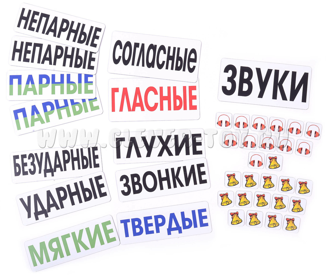 Чтобы не запутаться в звуках, которых в русском языке гораздо больше, чем букв, можно постараться наглядно представить себе их смысловые группы. Делая первые шаги на пути представление русской фонетики в понятном ребенку виде, мы выпустили большие магнитные карточки с классификацией звуков и магнитными колокольчиками для обозначения звонких согласных. В наборе 40 магнитов. Карточки со словами имеют размер 14х7 см, а маленькие карточки с картинками — 2,5х2,5 см.