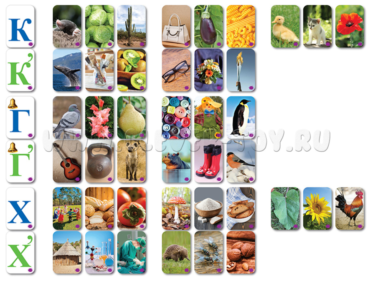 К, Г, Х, К’, Г’, Крот, Капуста, КаКтус, сумКа, баКлажан, маКароны, утёноК, КотёноК, маК; Голубь, Гладиолус, Груша, пуГовицы, пуГало, пинГвин; Хоровод, Хлеб, Хурма, муХомор, саХар, суХари, лопуХ, подсолнуХ, петуХ; Кит, Кисти, Кирпич, очКи, буКет, фаКел; Гитара, Гиря, Гиена, беГемот, сапоГи, снеГирь; Хижина, Химия, ХирурГ, еХидна, муХи, ореХи.