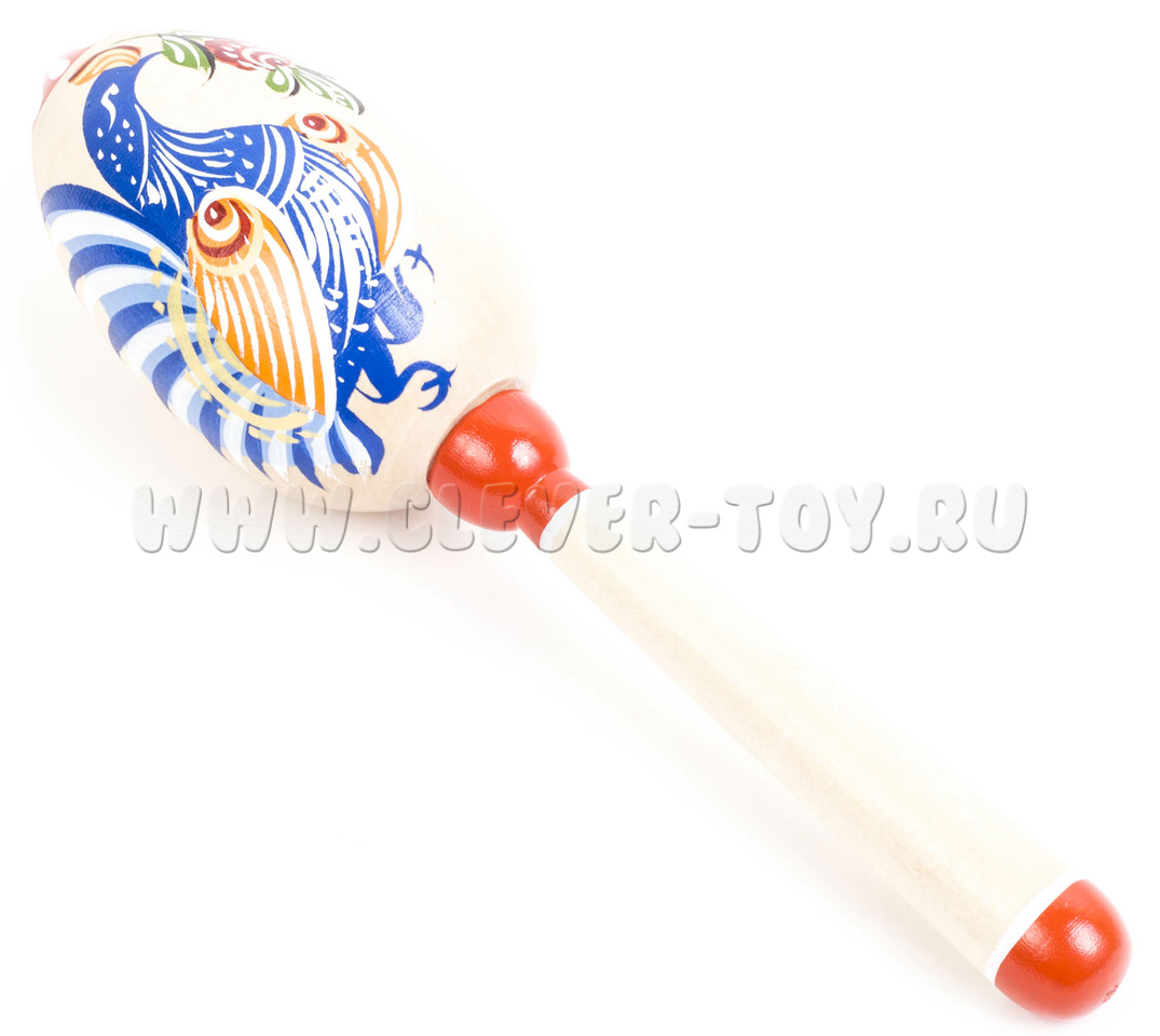 Погремушка представляет собой пустотелый деревянный предмет яйцеобразной формы. Внутрь погремушки засыпана охотничья дробь. В нижней части погремушки крепится фигурная ручка токарной работы. Материал: липа.