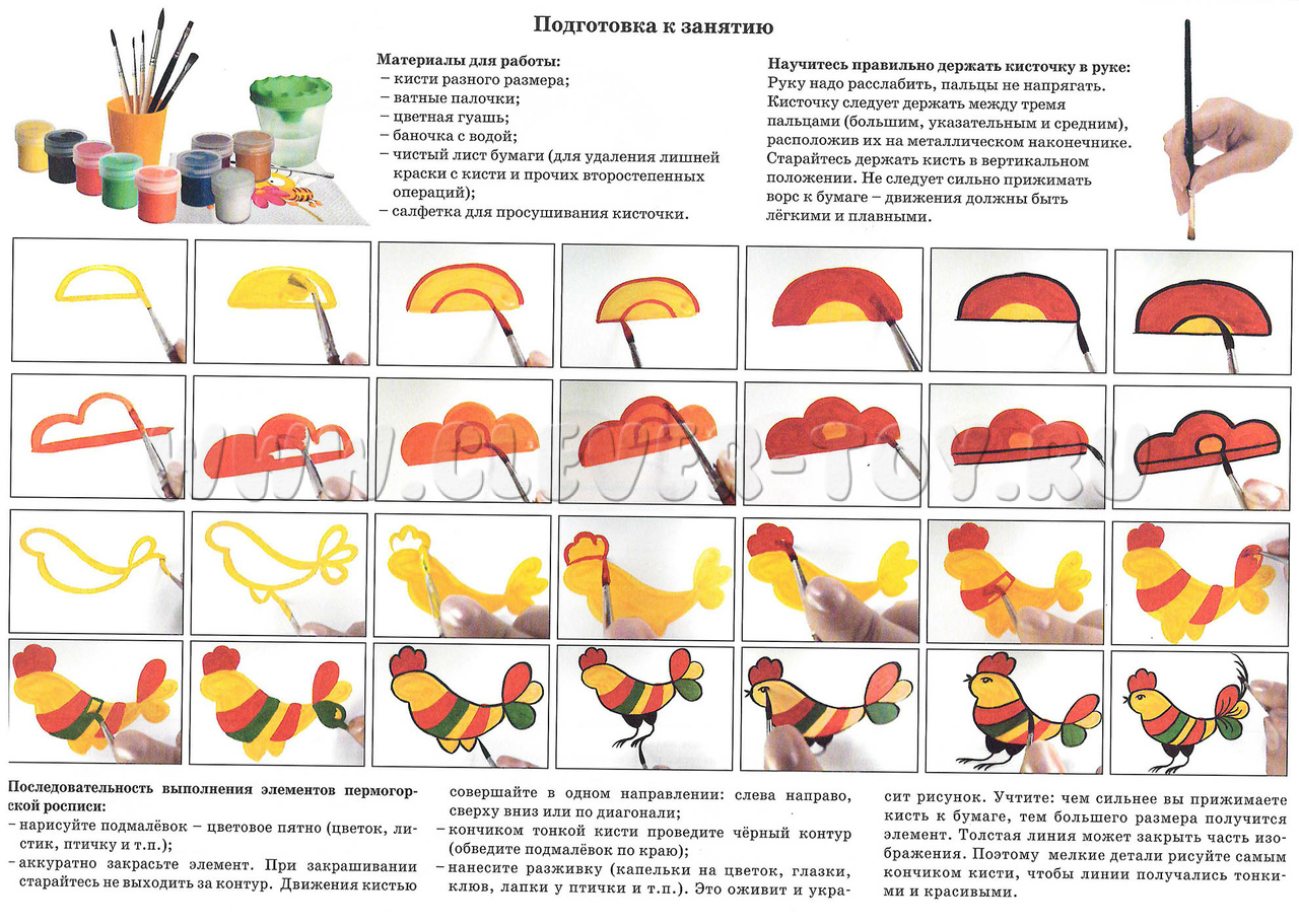 1. Последовательность выполнения орнамента пермогорской росписи;