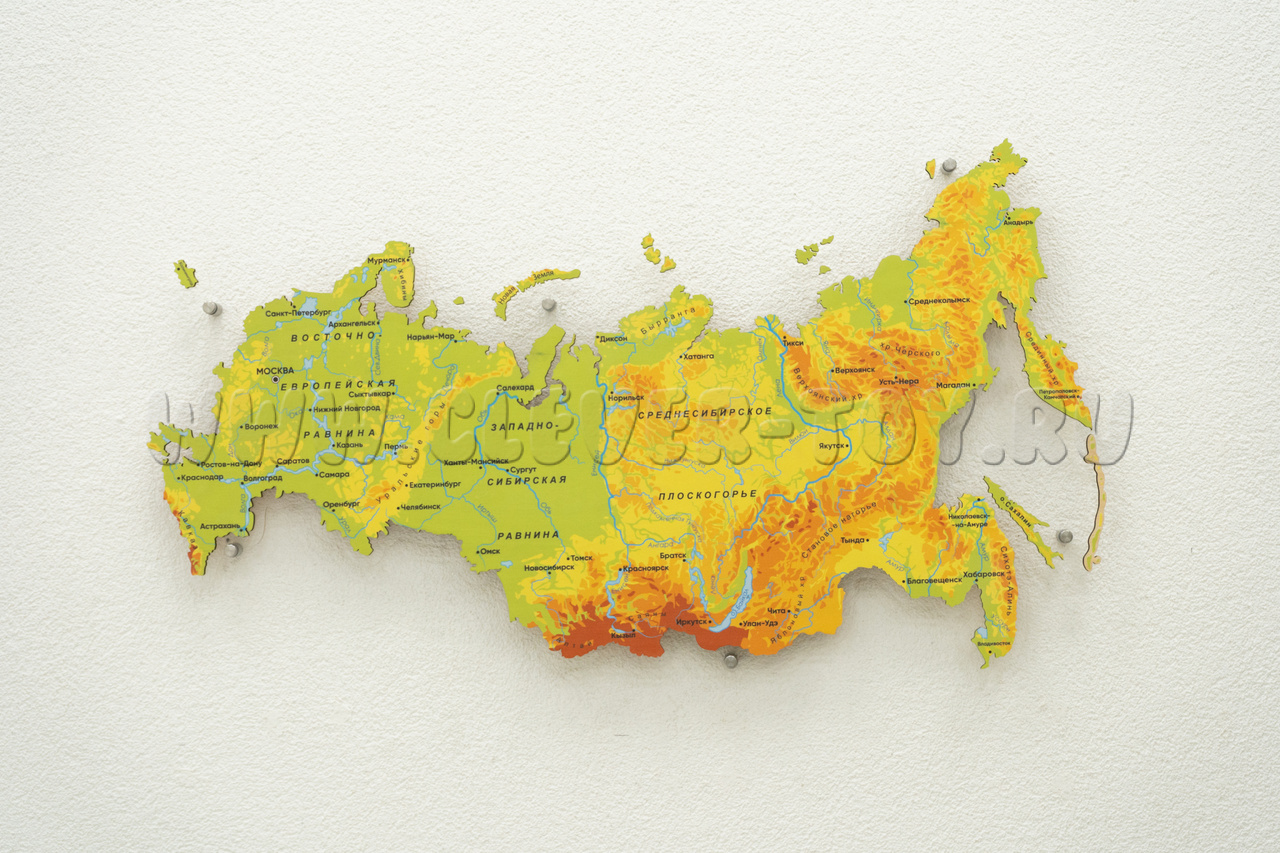 Полезное учебное пособие, с которым дети запомнят, где на территории РФ располагаются горы, равнины, плоскогорья, реки, озёра и водохранилища, а также выучат названия и расположение значимых российских городов.