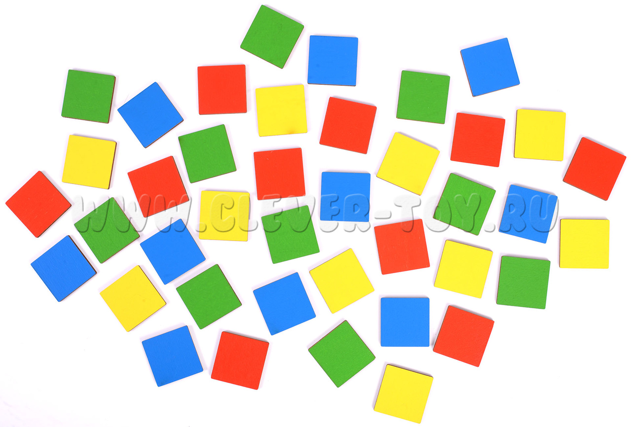 1. Игра "Цветные квадратики". Рассмотрите игровое поле вместе с ребенком. Посчитайте все фишки, спросите, фишек какого цвета больше (меньше) всего? Посчитайте, сколько фишек помещается на одной части игрового поля, на другой? Где больше? (Поровну)