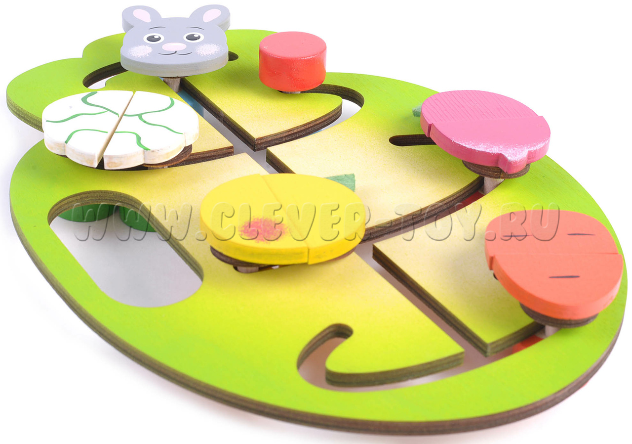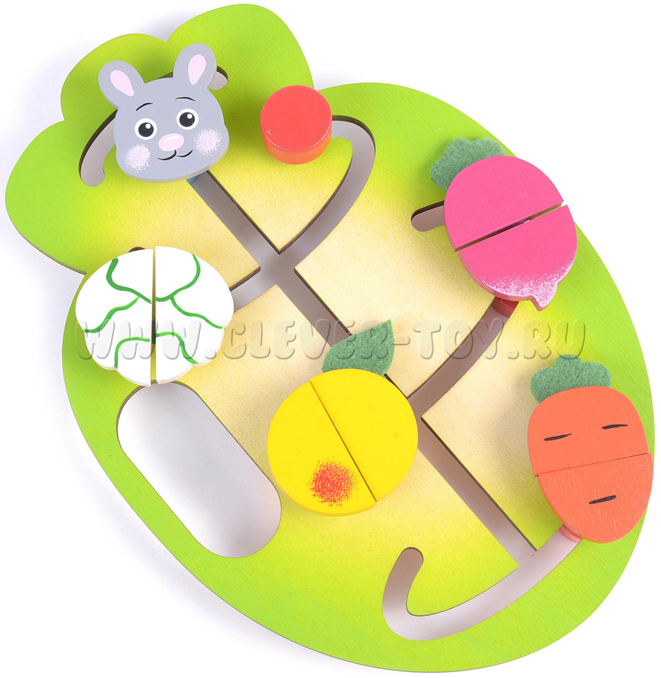 Игра «Накорми зайку» представляет собой лабиринт, состоящий из деревянного поля и фишек (капуста, морковка, яблоко, редиска) разделённые пополам, которые движутся по пазам.