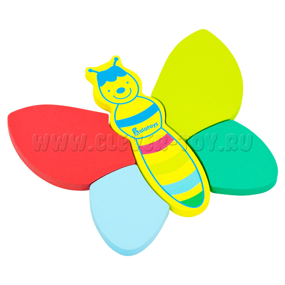 • 5-ти разноцветных деталей, из которых складывается фигурка бабочки (голова и туловище с нарисованной улыбчивой мордочкой, 4 крылышка), окрашенных вжёлтый, голубой, тёмно- и светло зелёный, красный цвета.