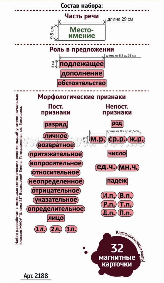 Эти карточки станут незаменимым помощником для учителей начальной и средней школы, изучающих русский язык. Яркие и гибкие, они изготовлены без бумаги и картона, что позволяет легко мыть их. Карточки имеют четкую и яркую печать, а всего в наборе 32 штуки. Они разделены на карточки с постоянными и непостоянными признаками местоимения. Главная карточка "Местоимение" имеет размер 29 на 9,5 см, остальные карточки — 5 см высотой. Все углы закруглены, чтобы предотвратить возможные травмы во время игры.