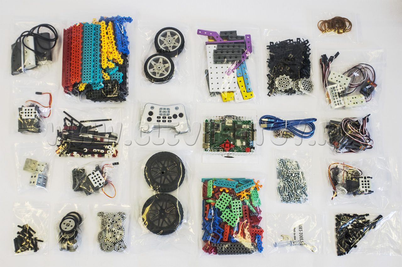 Набор пластиковых (4 вида) и металлических (3 вида) валов, пластиковых втулок и пластиковых, резиновых и металлических муфт, железных болтов (3 размера) и гаек, шайбы.