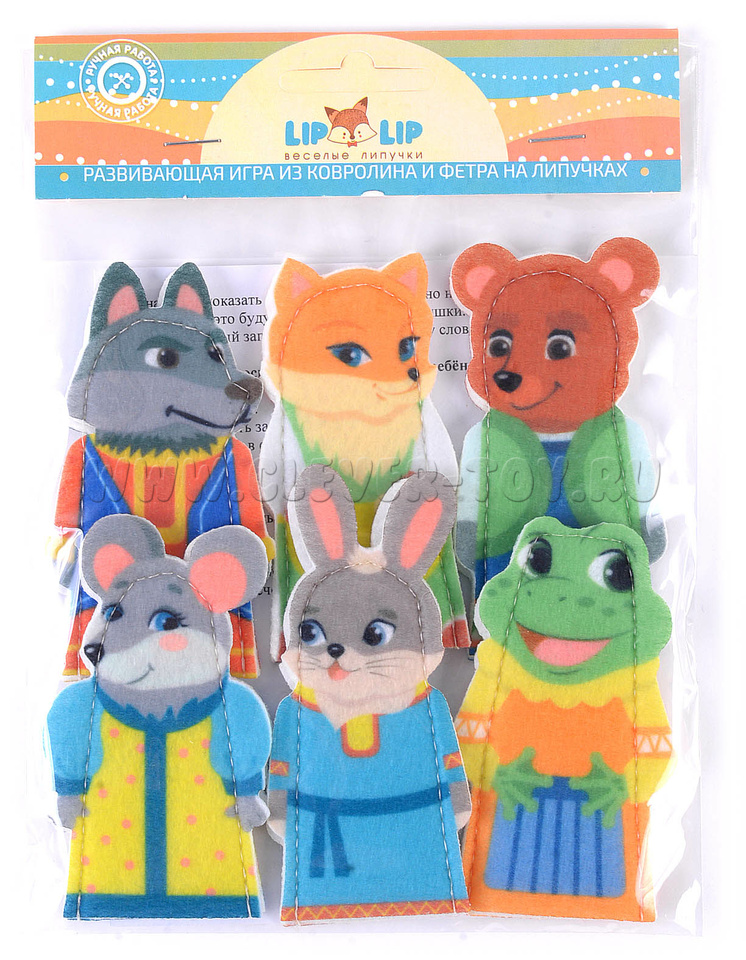 В комплект пособия входят пальчиковые куклы: мышка, лягушка, заяц, лиса, волк и медведь (6 шт.).