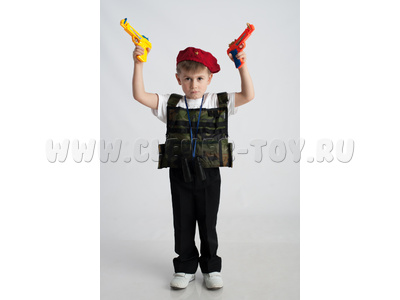 Комплектация (2 предмета): "бронежилет" (застежки - регулировки 2 сверху, 4 по бокам - липучки, спереди 2 кармана и множество петель из стропы для размещения "боекомплекта"); красный берет со звездой (регулируется по голове с помощью шляпной резинки и фиксатора).