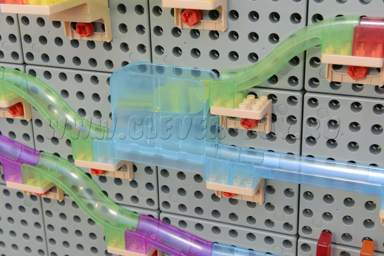 В комплект входит 63 детали, среди которых разнообразные направляющие элементы: прямые, изогнутые, зигзагообразные, с перепадами высот и поворотами. Все детали легко монтируются на поверхность STEM-стены при помощи специальных кронштейнов и винтов, которые входят в набор вместе с инструментами для установки.